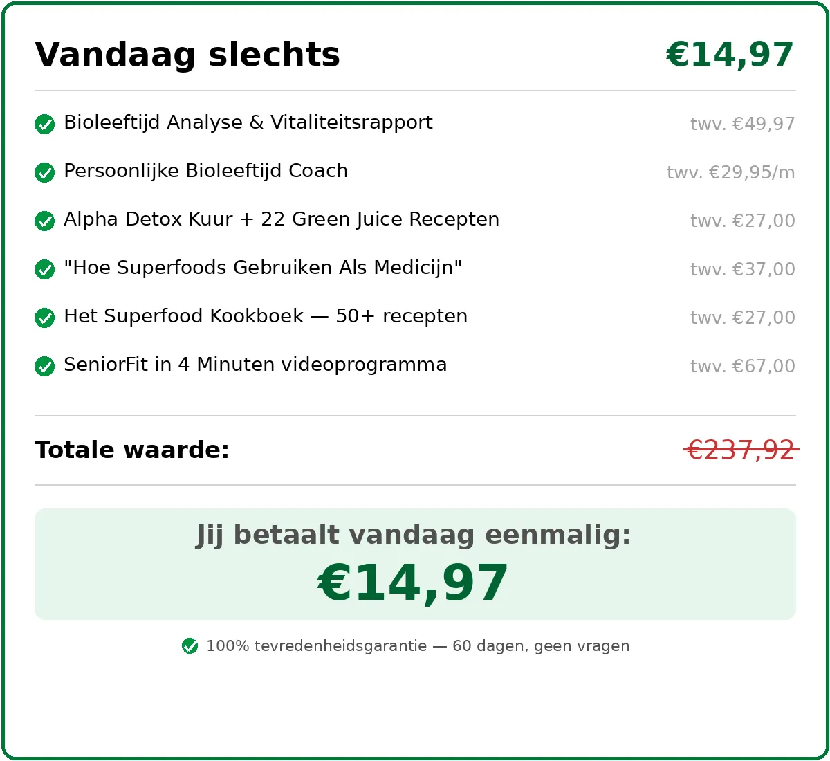 Je hebt 24/7 toegang tot je persoonlijke Bioleeftijd coach en alle materialen. Je bepaalt zelf je tempo en hoe lang je het programma volgt. Je hebt levenslang toegang.
